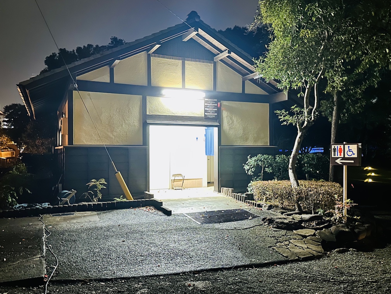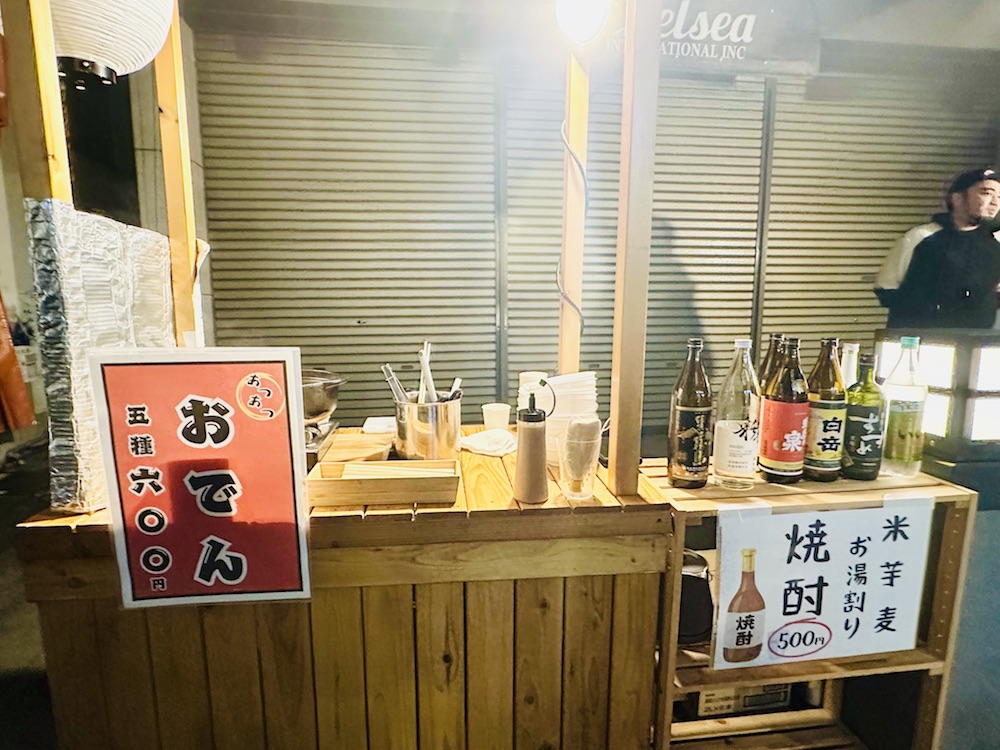 水前寺成趣園正面入口前の参道には看板が設置され参道もライトアップされています。参道沿いの店舗も屋台を出店しており行きと帰りにちょっと寄って温かいフードやドリンクが購入できます。