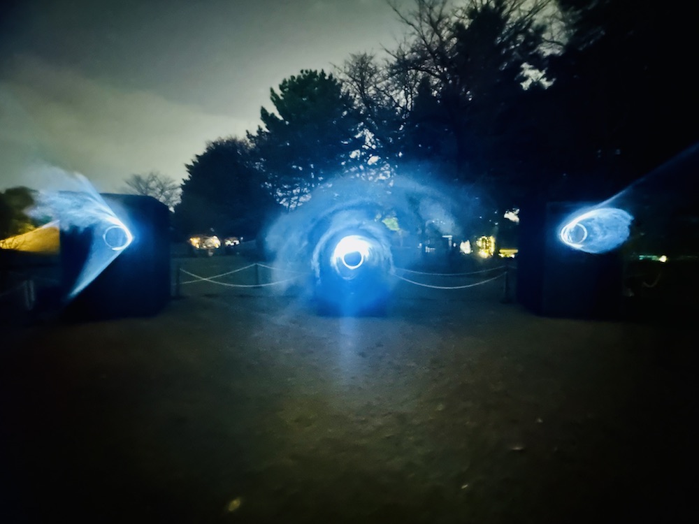 写真では分かりにくいですが、光の周りをスモークが渦を巻いており、引き込まれそうな感覚になります。