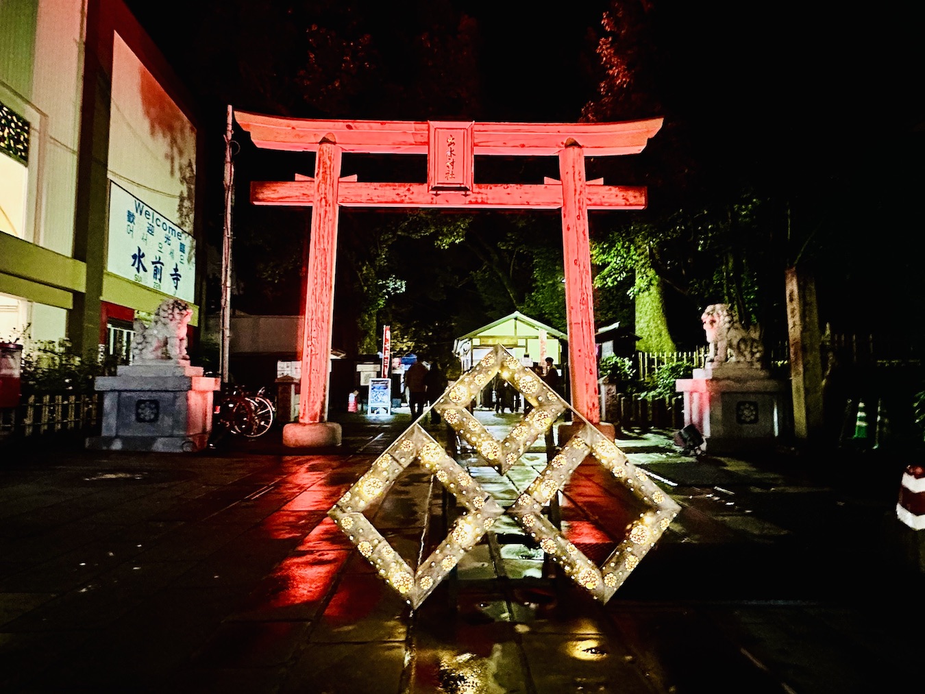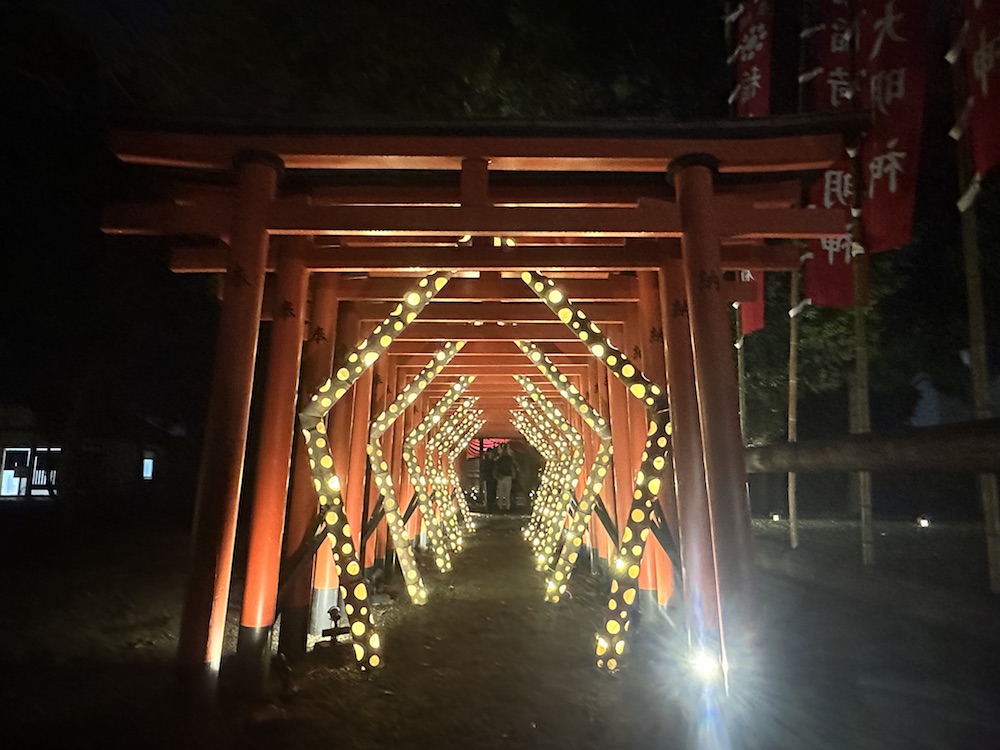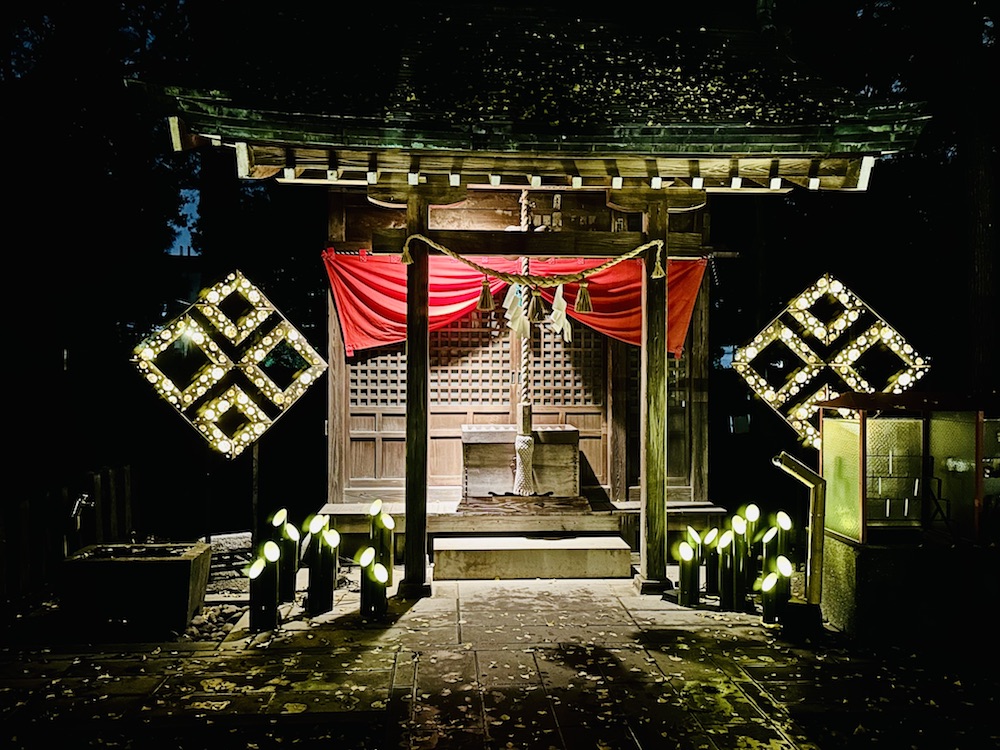 その先の赤い鳥居の稲荷神社もライトアップされ、鳥居をくぐってお堂に参拝すると仕掛けが作動するので行かれた方はぜひ体験してみてください。