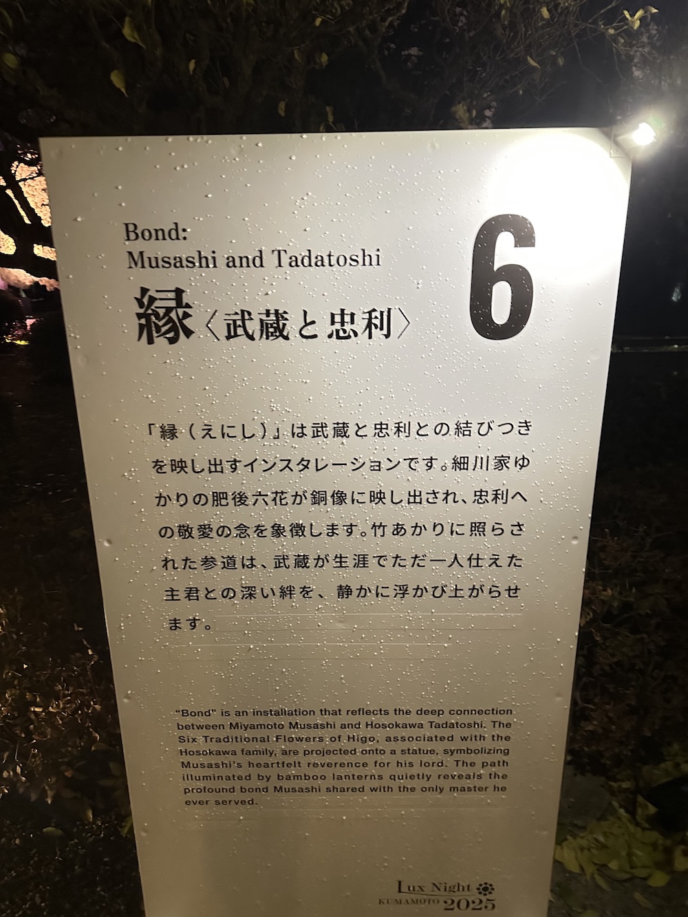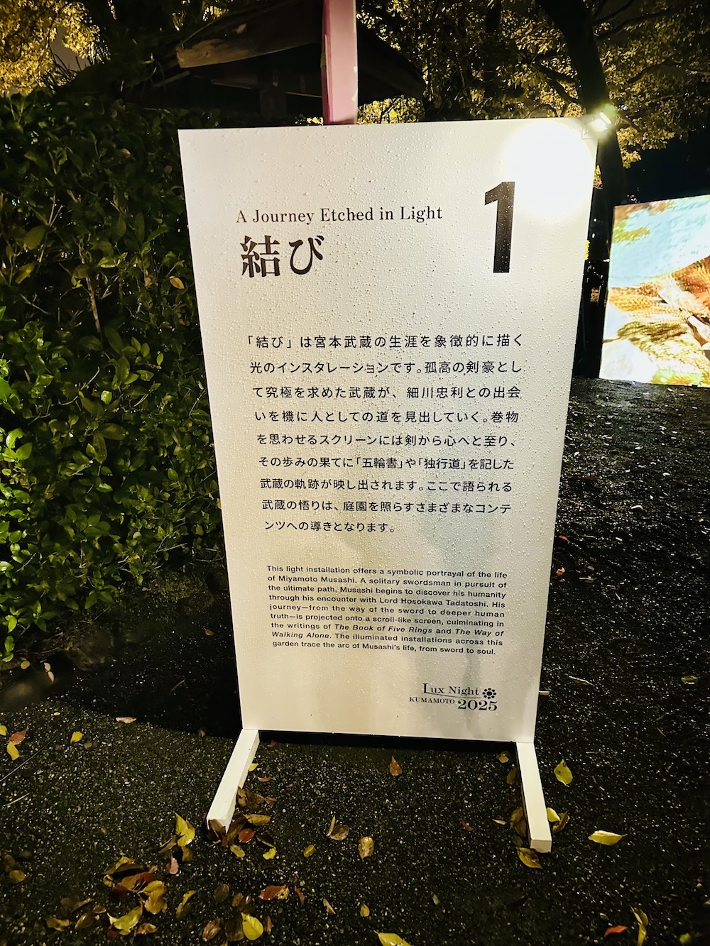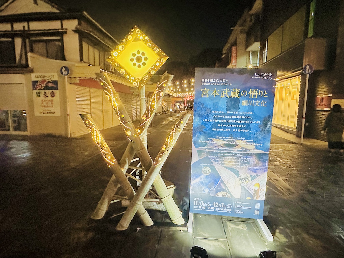 今年の「Lux Night KUMAMOTO 2025」は宮本武蔵の悟りと細川文化ということで、「人間武蔵」をテーマに竹あかりと光のアートがおりなす水前寺成趣園をナイトウォークできます。