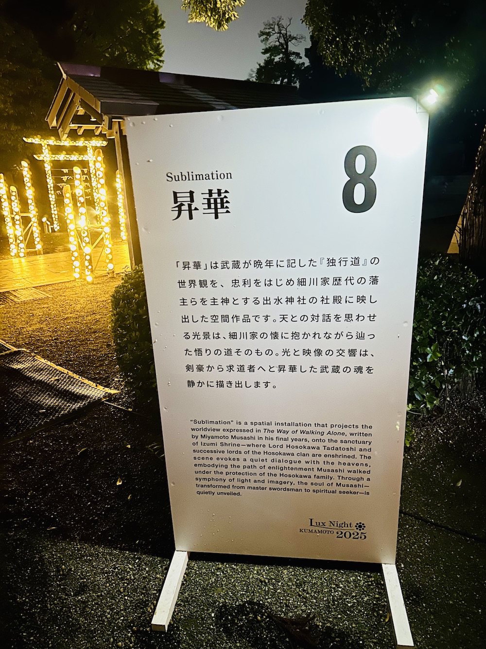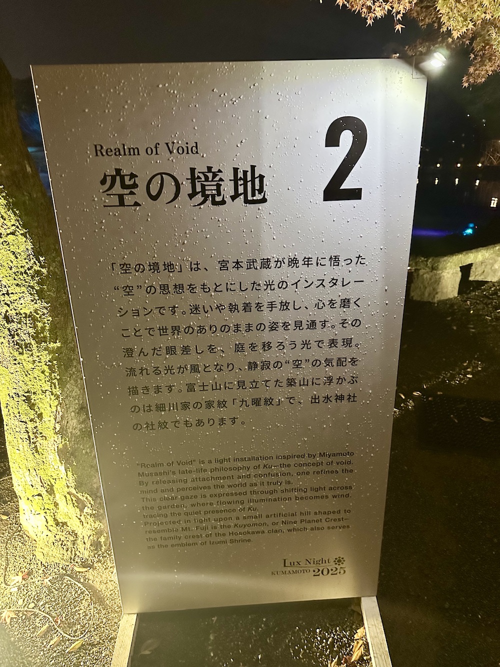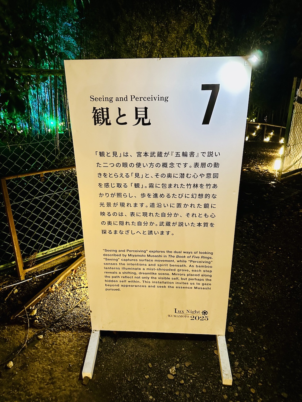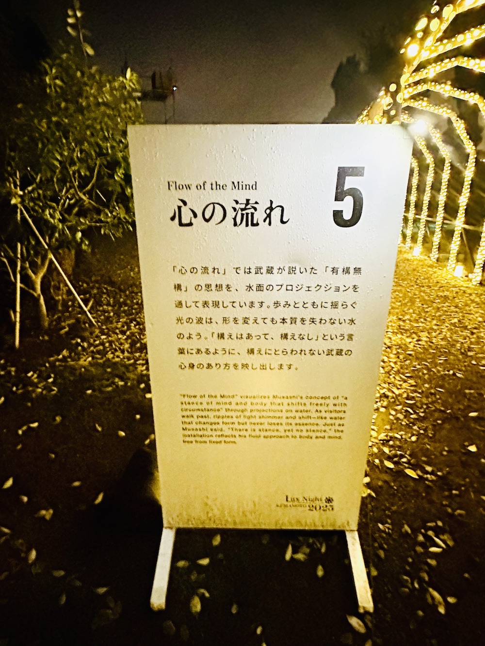 今年の「Lux Night KUMAMOTO 2025」は宮本武蔵の悟りと細川文化ということで、「人間武蔵」をテーマに竹あかりと光のアートがおりなす水前寺成趣園をナイトウォークできます。