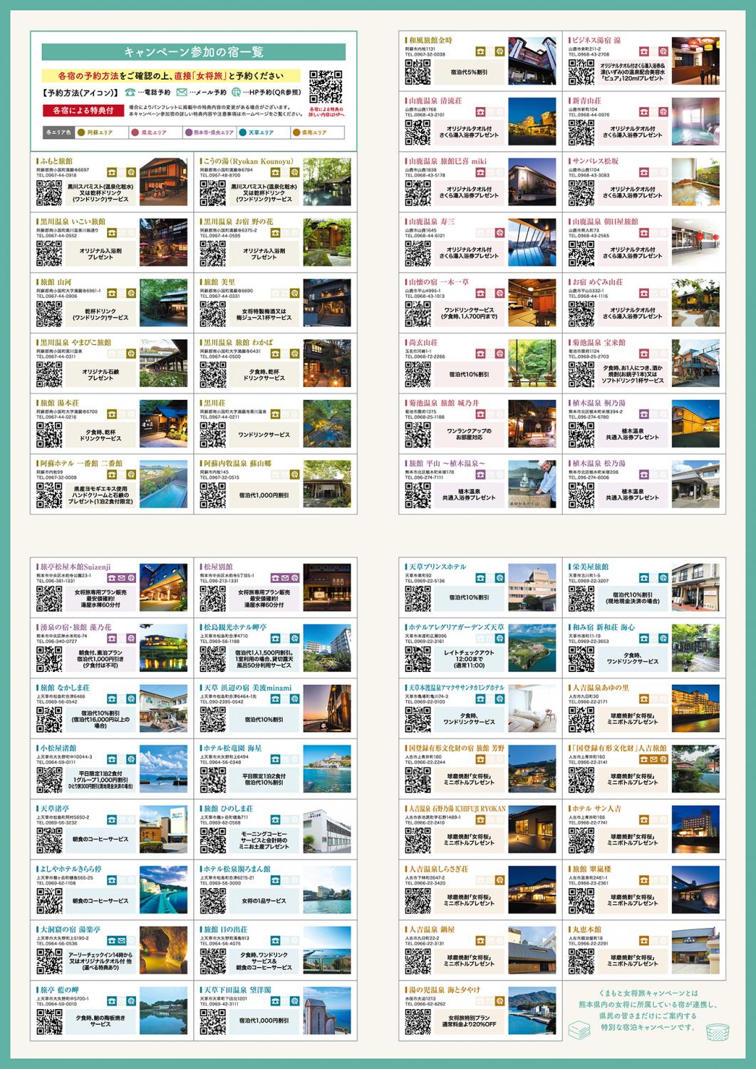 キャンペーンの内容は、熊本県旅連・くまもと女将会所属の熊本県内の宿が特別割引やドリンクサービス、プレゼントなど様々な宿オリジナル特典を用意している熊本県民限定のキャンペーンになります。