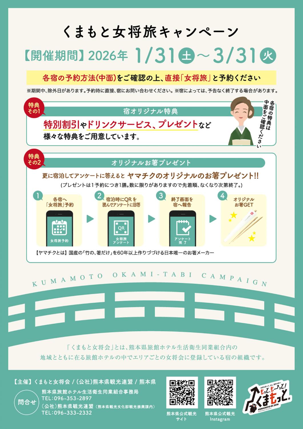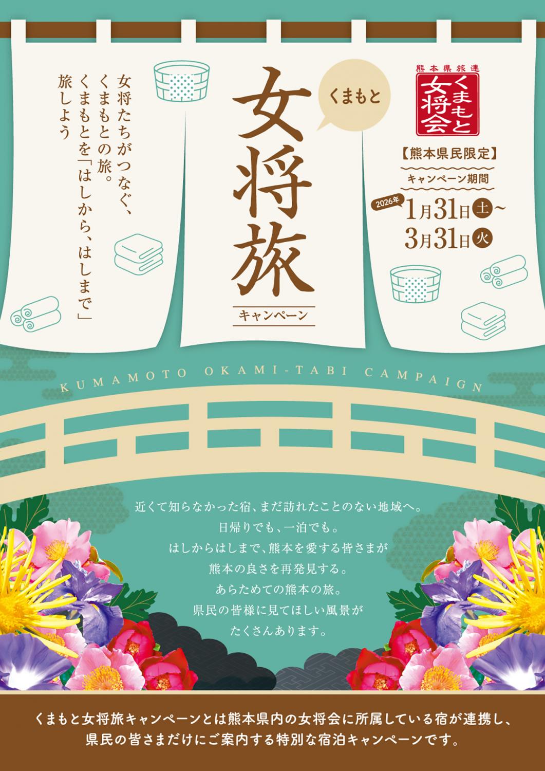 2026年1月31日(土)から3月31日(火)まで熊本県民限定で、お得に宿泊できる「くまもと女将旅キャンペーン」を詳しく紹介します。