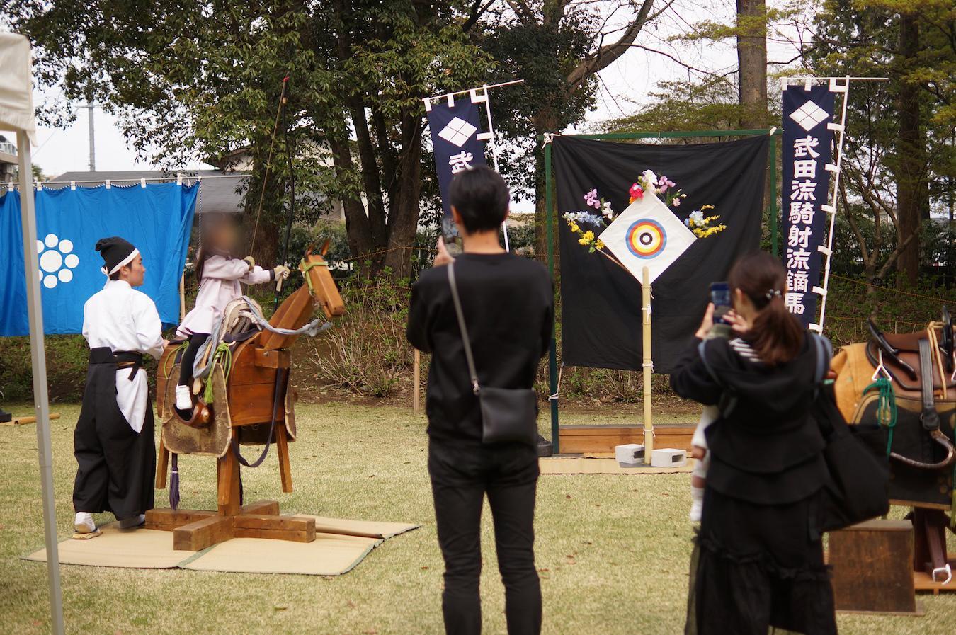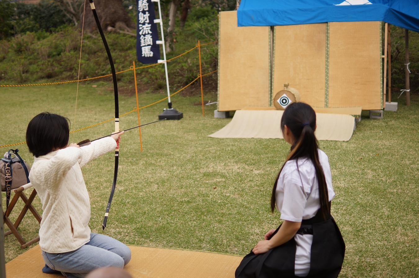 いこいの広場では武田流騎射流鏑馬として、木馬騎乗体験、弓道の体験として四半的体験、衣装着付け体験があります。大人1,000円、小人(小学生6年生まで)500円で誰でも体験できます。