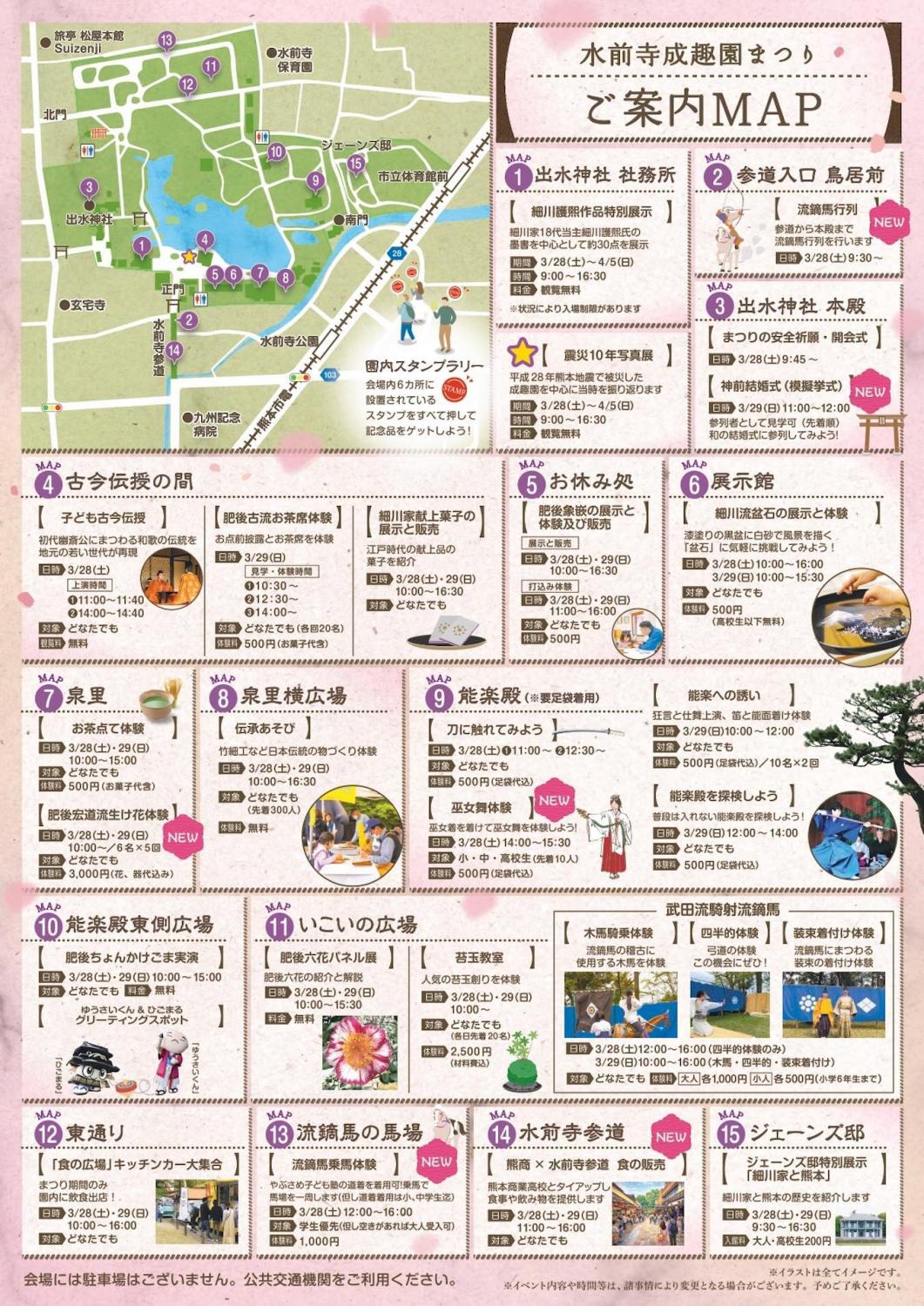 イベント開催場所が水前寺成趣園内の場合は水前寺成趣園の入園料(大人400円・高校生以下は無料)が必要になります。また、会場駐車場はないので、周辺駐車場を利用するか公共交通機関を利用しての来園がおすすめです。
