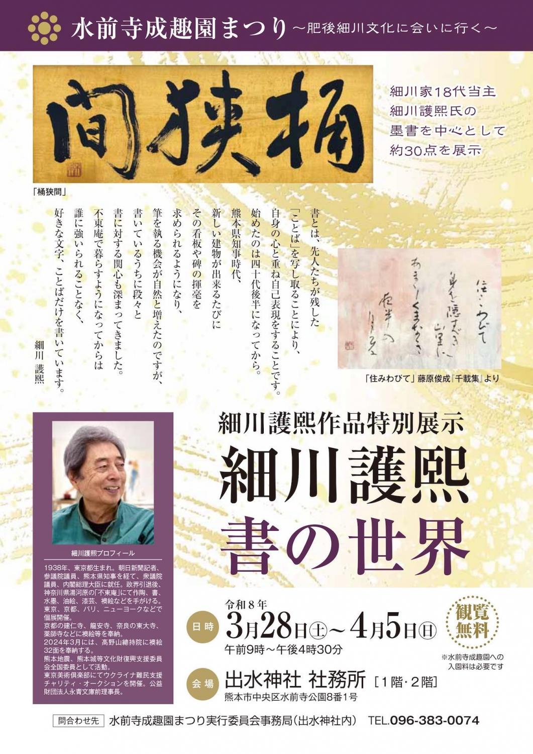 また、水前寺成趣園内の出水神社社務所では、墨書を中心とした約30点を展示した「細川護熙作品特別展示」が3月28日(土)から4月5日(日)まで開催されます。