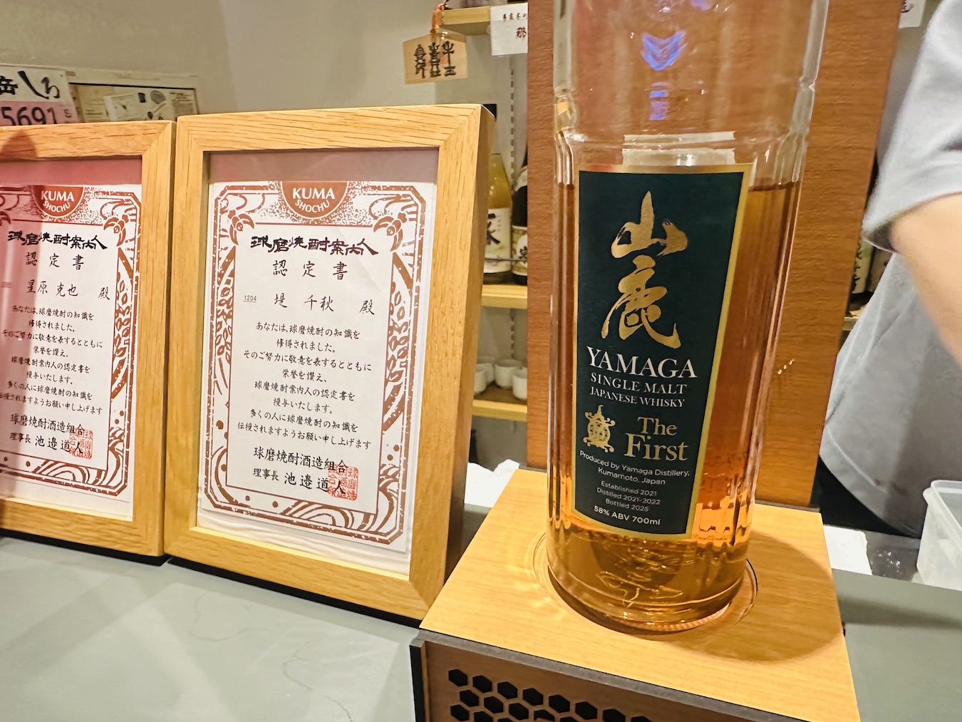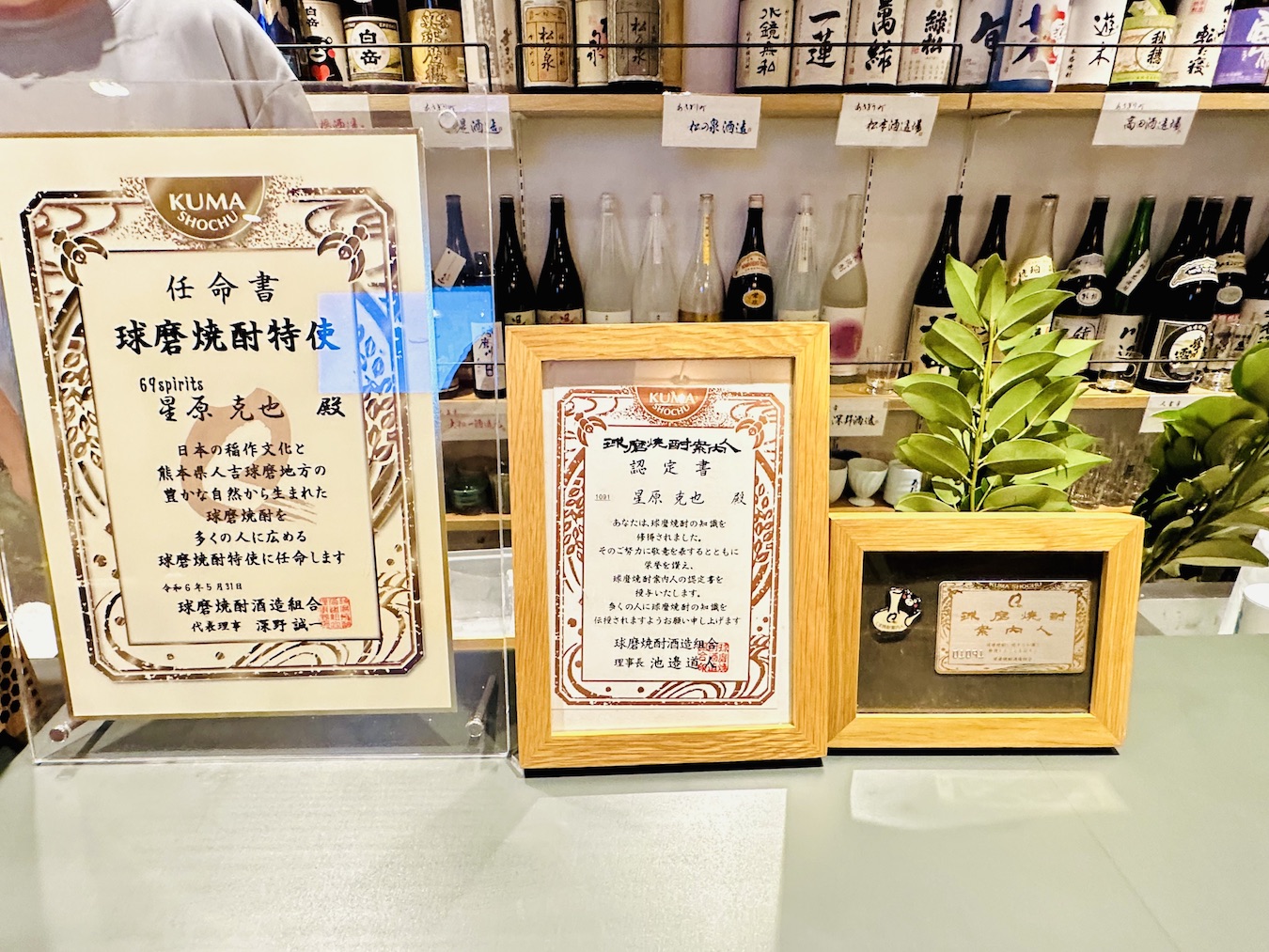 お店が休業中の約2ヶ月間は周りからの多くの支援で継続ができ、この店舗が「泊まり木」として独り歩きしていると実感したそうです。精神的課題より仕事の有無が重要と認識し、酒文化を再見直して、くまもと県産酒検定を受験し球磨焼酎に限らず熊本の日本酒やジン、ウイスキーなども視野に入れていきます。との事でした。写真左の「球磨焼酎特使」は球磨焼酎に深い理解と関心を持ち応援していただける公人及び著名人が任命されるとのことでまだ数人しかいない選ばれた特使みたいです。