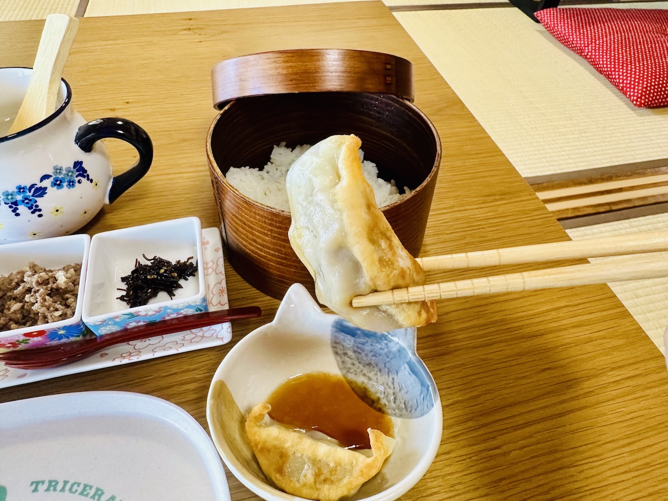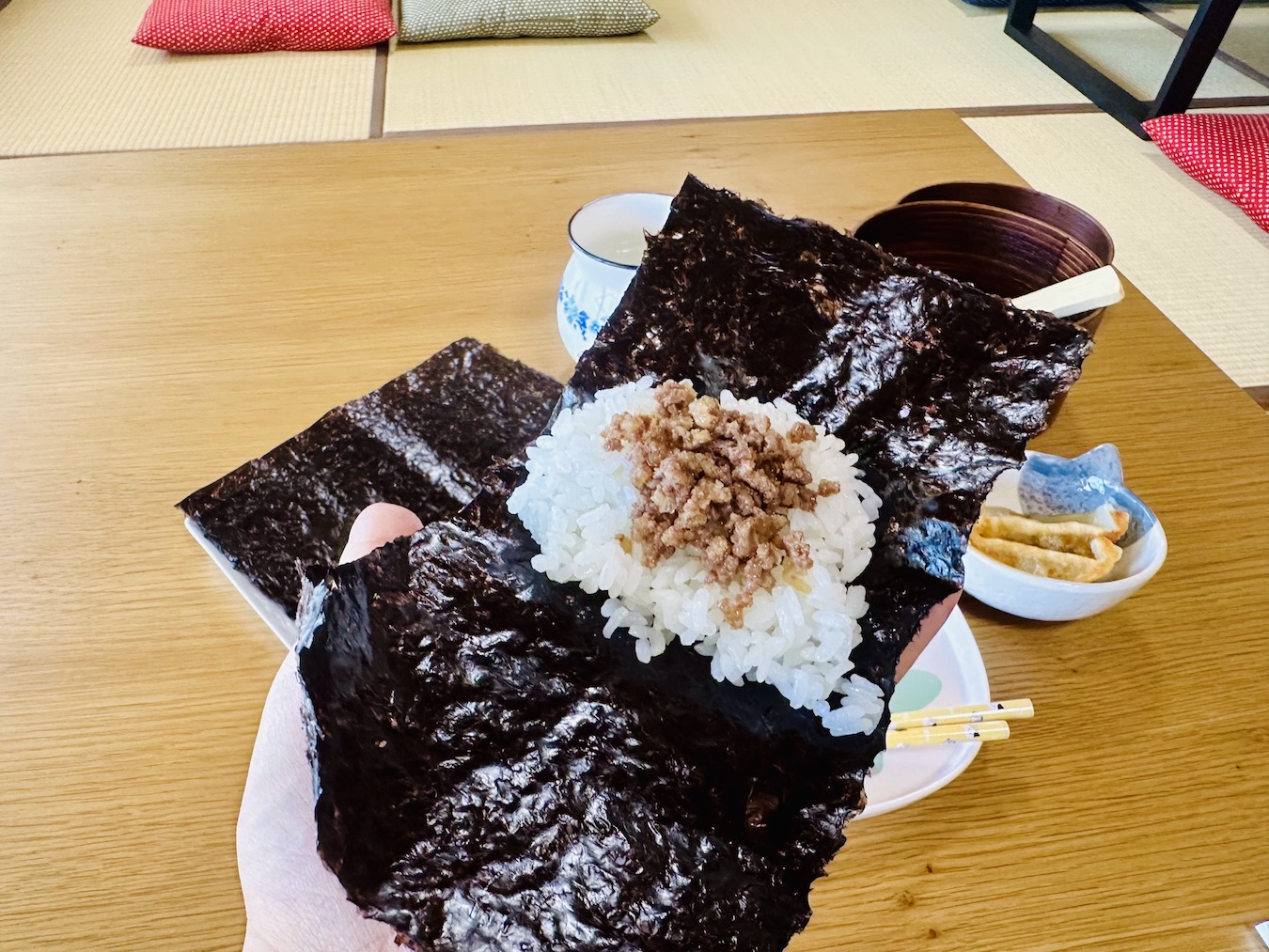 日替わりでおにぎりの具が2種類あります。本日は、東京から取り寄せた手作りで人気のこんぶと、甘辛く味付けした自家製の馬肉そぼろでした。それに馬ウマぎょうざ2個とデザートが付いてます。