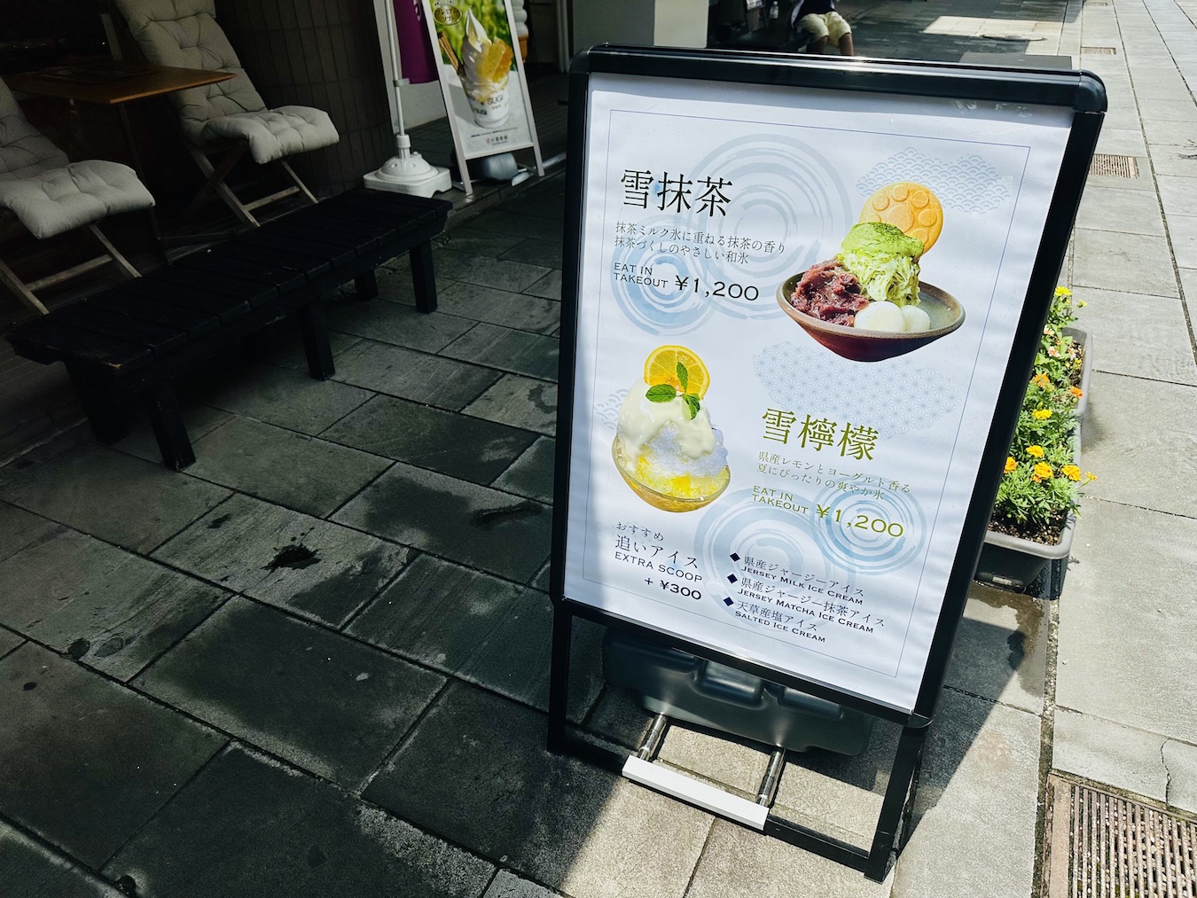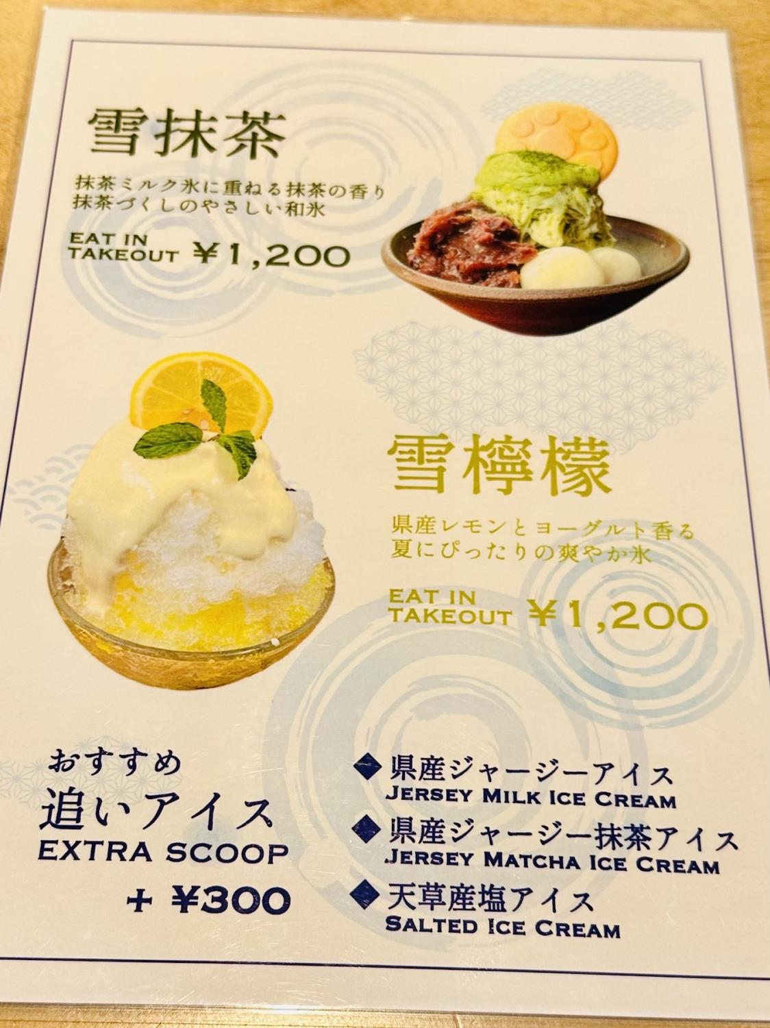 かき氷は雪檸檬の他に、こちらも昨年から人気の雪抹茶(1,200円)があります。もちろんコーヒーや紅茶などのカフェメニューもあり、こちらもテイクアウトも可能です。
