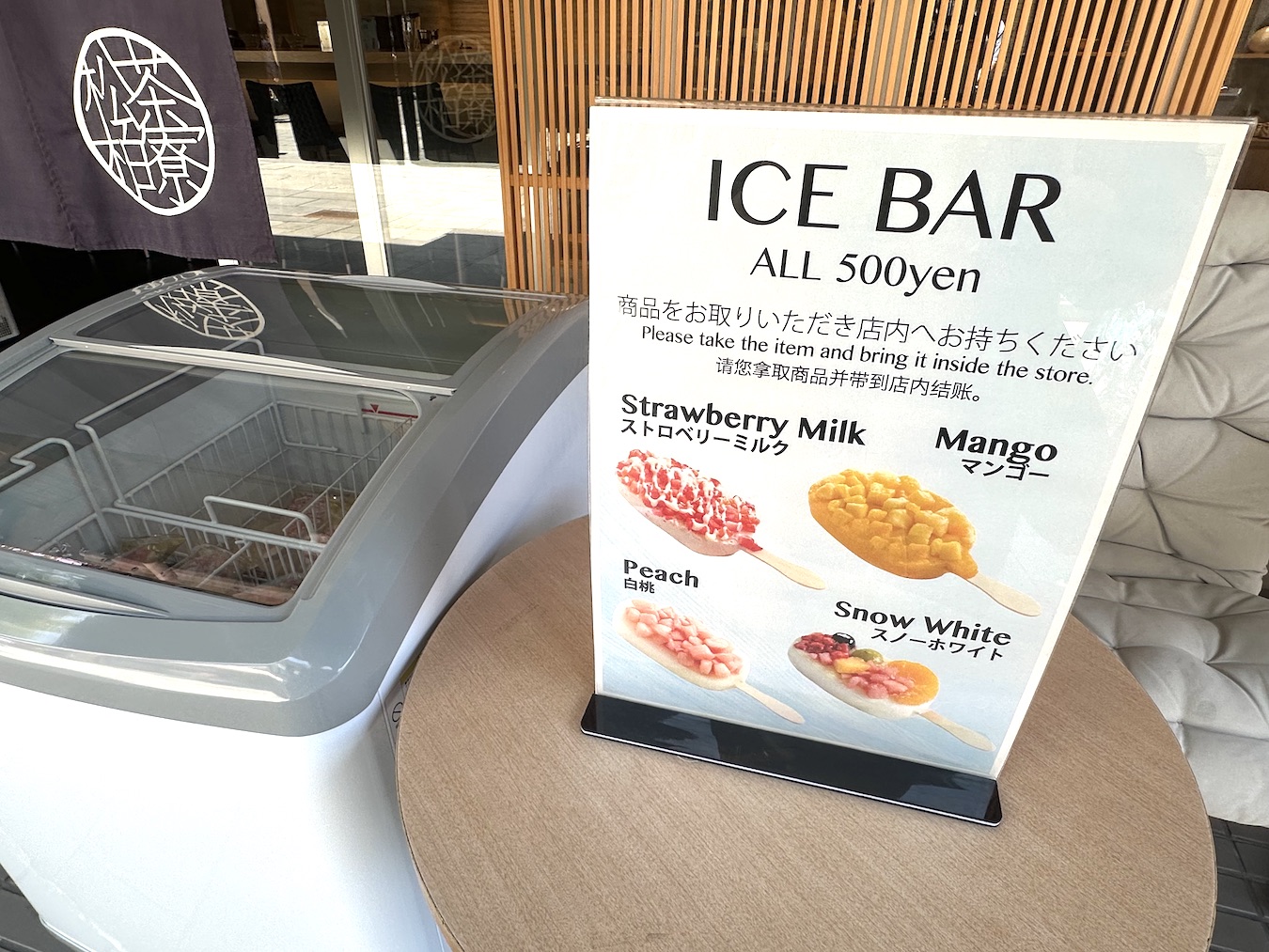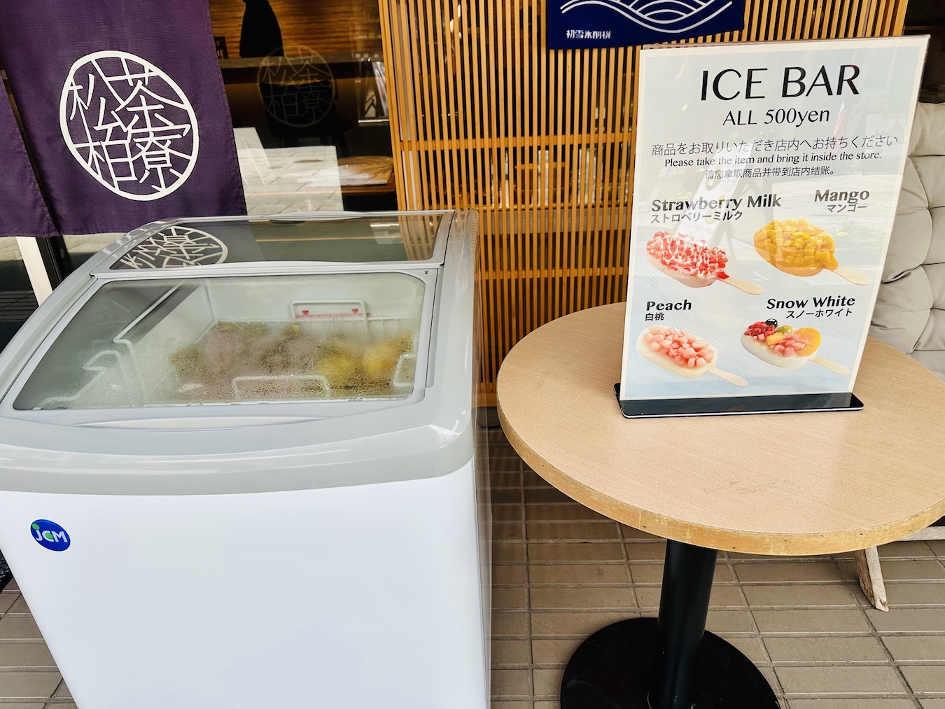 入り口横には、ICE BARの冷凍ボックスがありストロベリーミルク・マンゴー・白桃・スノーホワイトの4種類がありました。場所が水前寺参道ということで海外旅行者も多く取材時もひっきりなしにICE BARを買われていました。