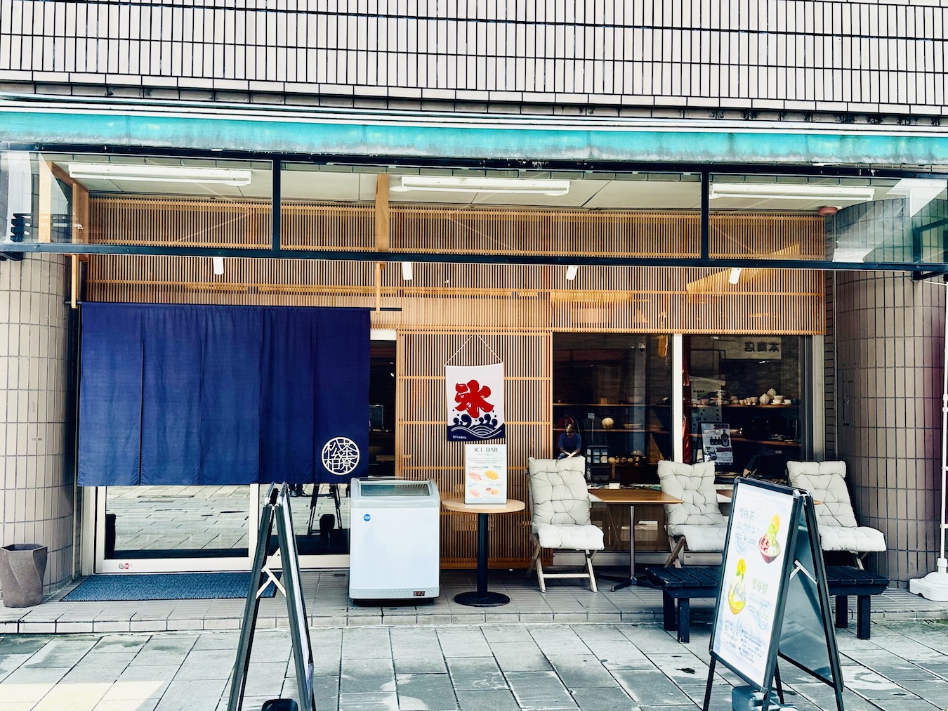和風茶屋を思わせる外観です。かき氷メニューが発売されているので店頭に「氷」のタペストリーが掲げられています。