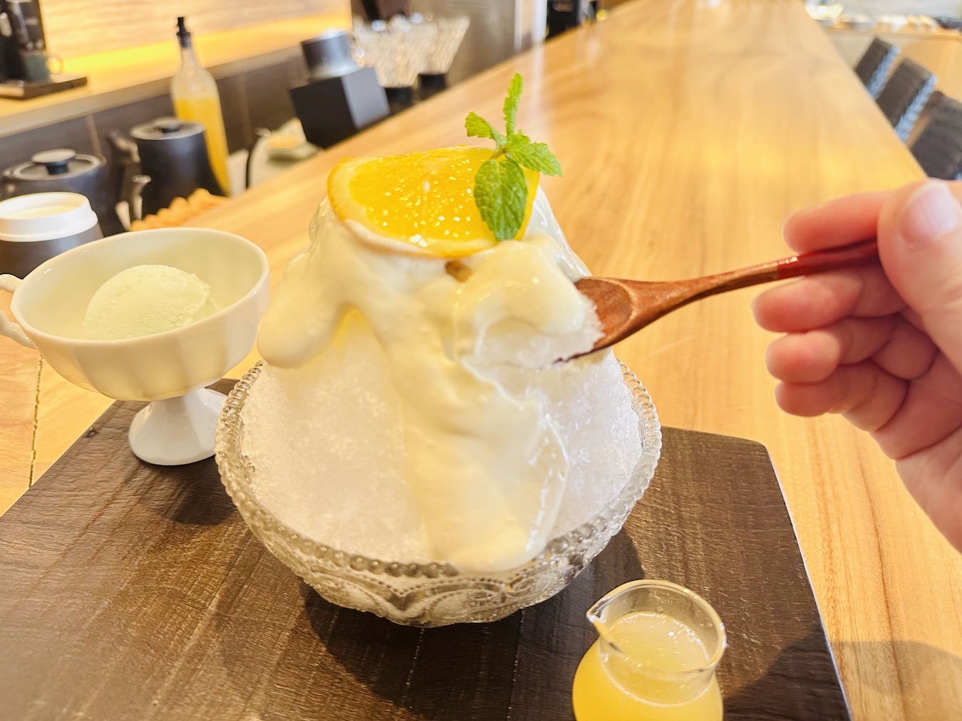 器から溢れるほど山盛りなので、すこし食べてから檸檬シロップをかけていただきました。もちろん食べ方は自由なので最初からかけてもOKです。
