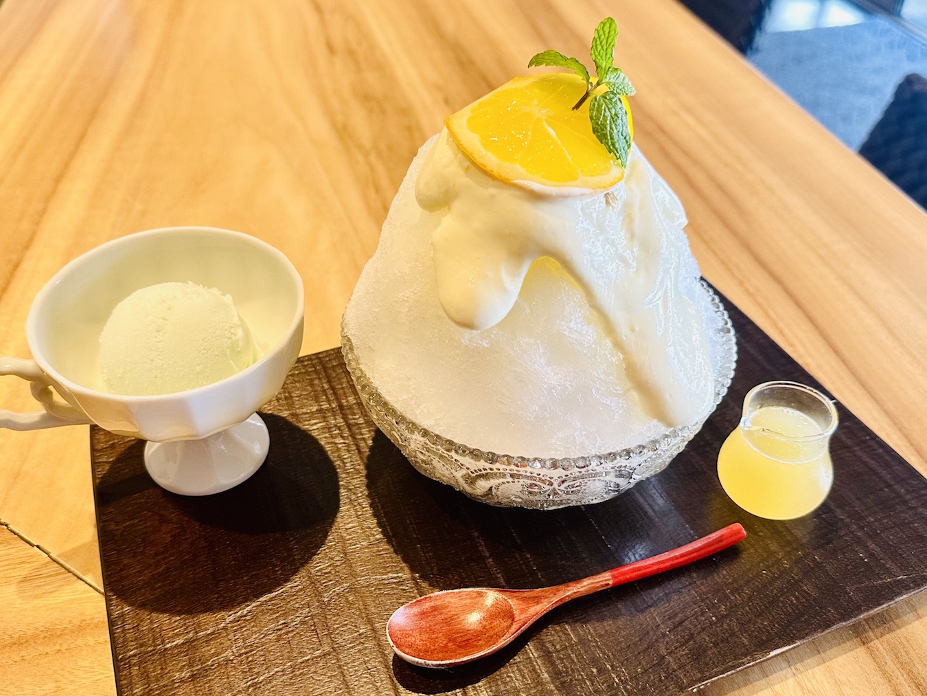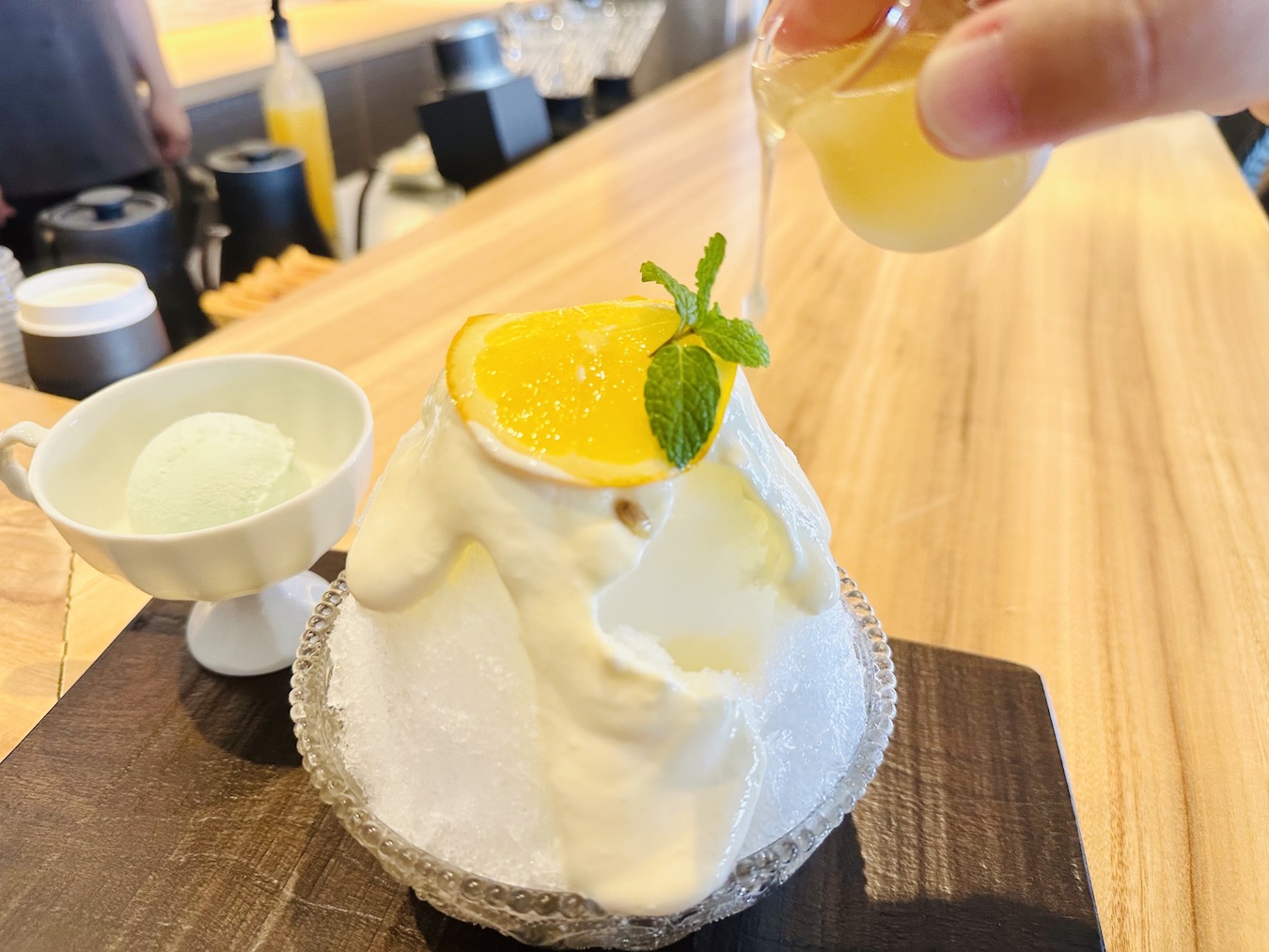 今季から新登場した雪檸檬はマスカルポーネチーズが入ったヨーグルト風味のソースがかかっていて輪切りの自家製蜜レモンが乗っています。