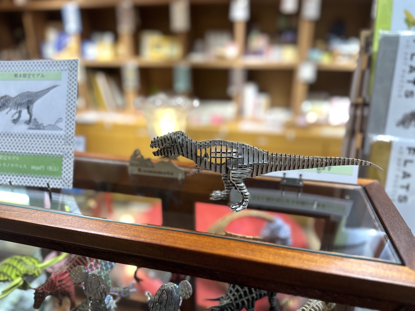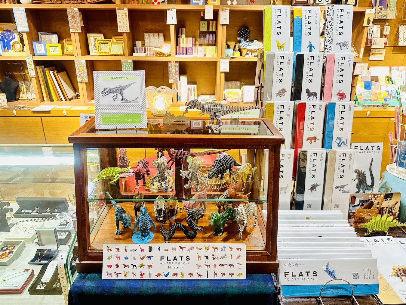 立体ダンボールクラフト作製のFLATSのミニチュアクラフトシリーズ「FLATS 4D ART PUZZLE」も販売されており、牛や馬、ウサギや辰など干支になぞらえたラインナップや各種恐竜の商品が並ぶ中、熊本限定モデル、ティラノサウルスが注目を引きます。