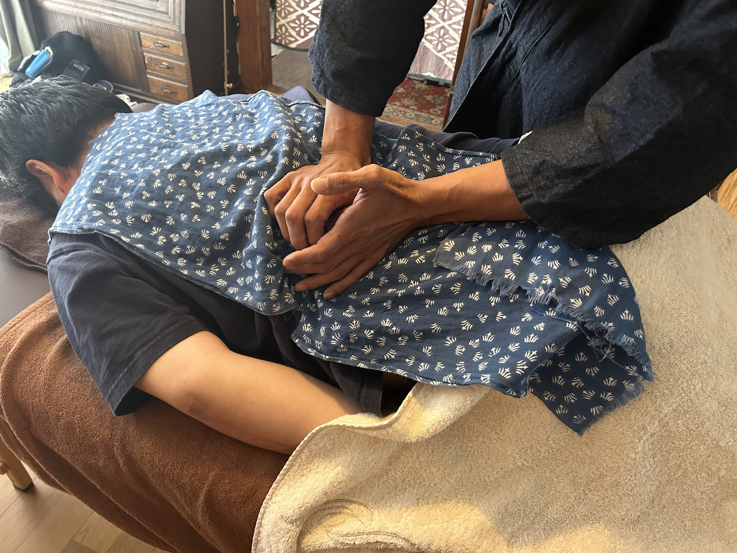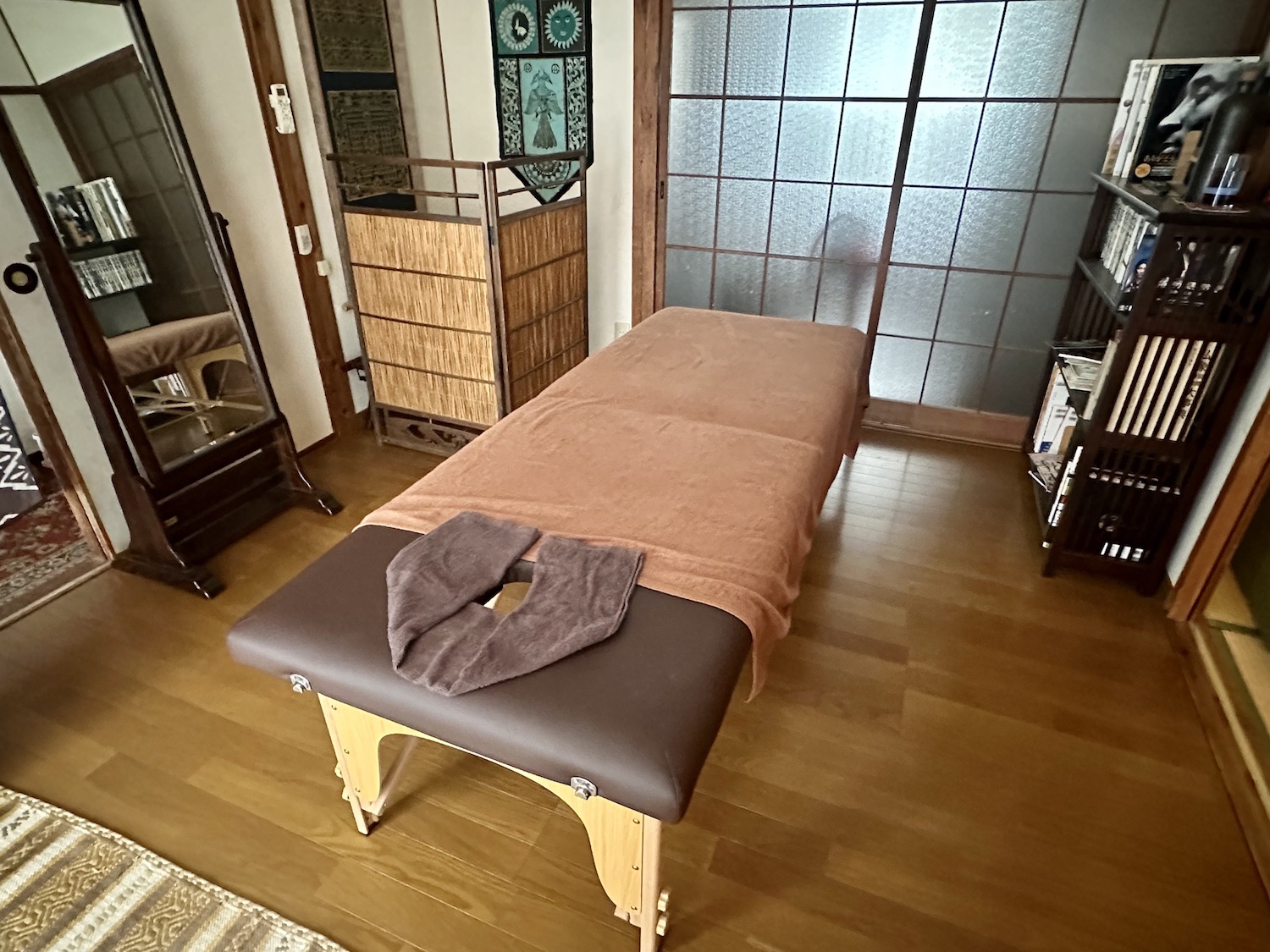 茶房室で今日のマッサージ箇所など話した後にマッサージを開始。