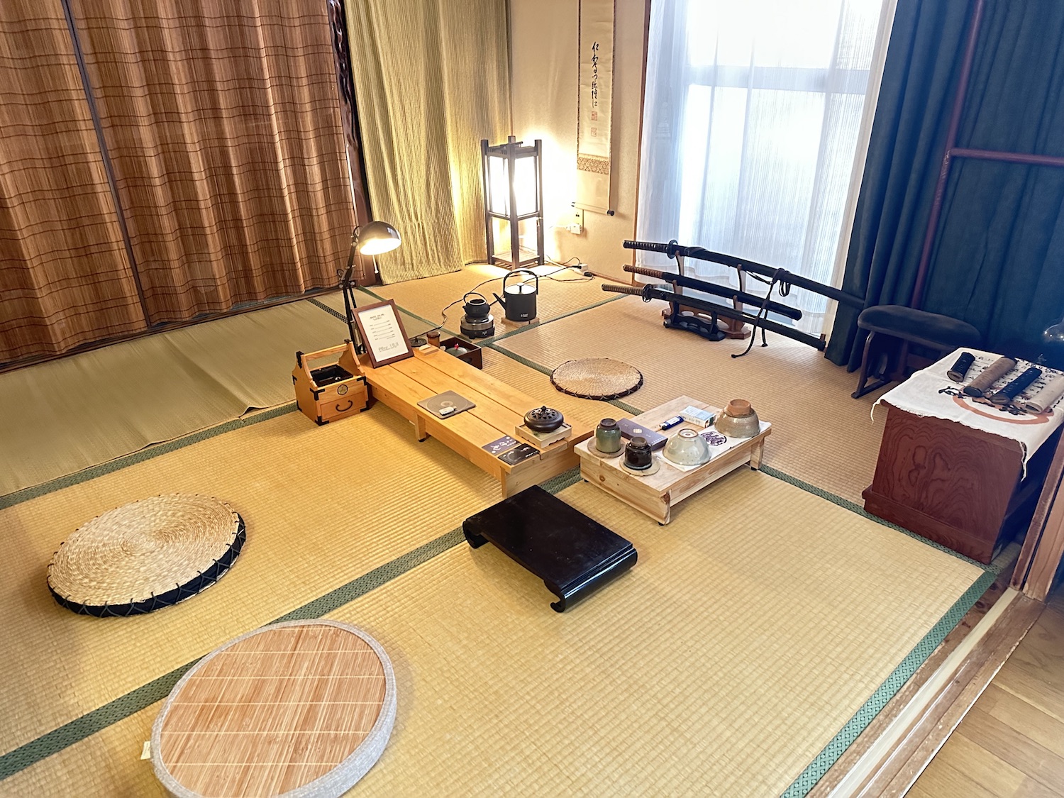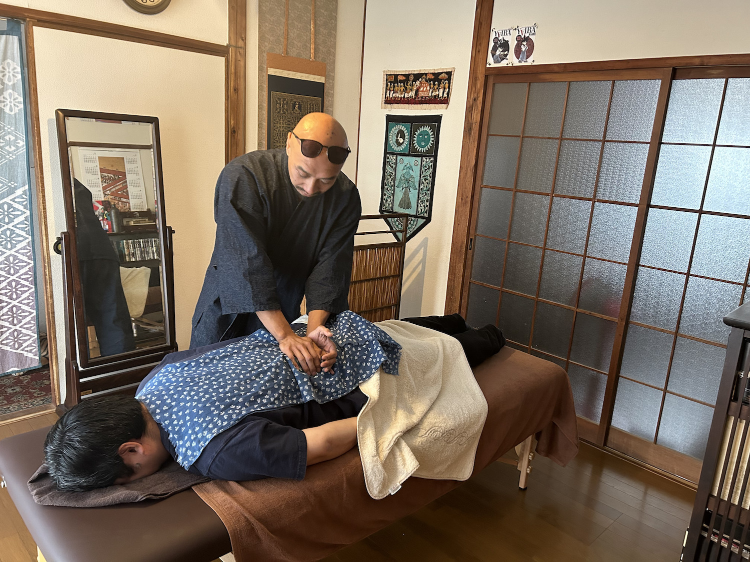 建物に入ると、手前の部屋にマッサージを行うマッサージ台があり、奥の部屋に茶室を模した茶房室があります。