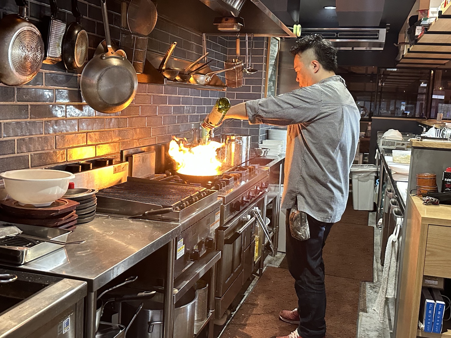 フランベも豪快な調理風景も楽しみつつ、一気にいい香りがしてきます。